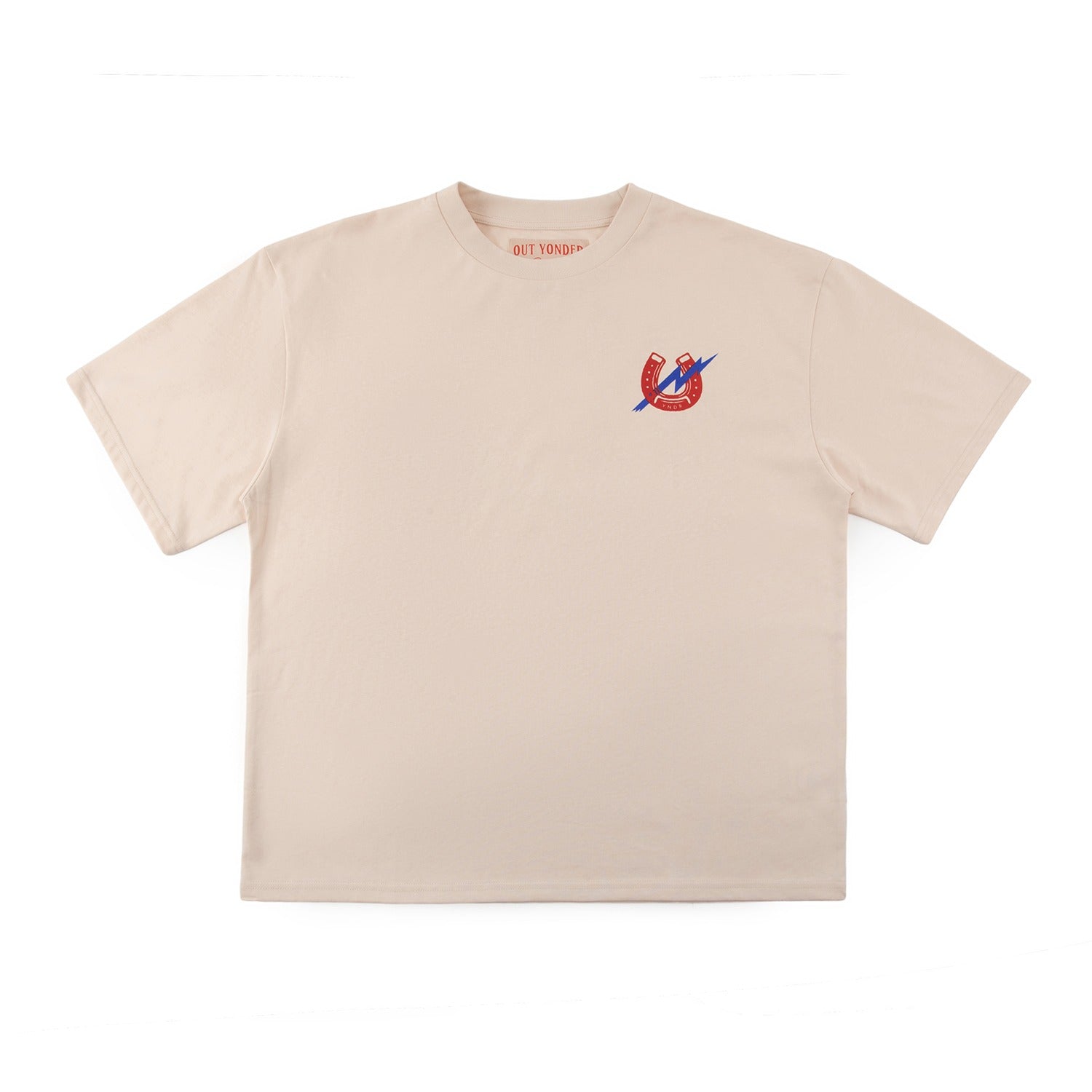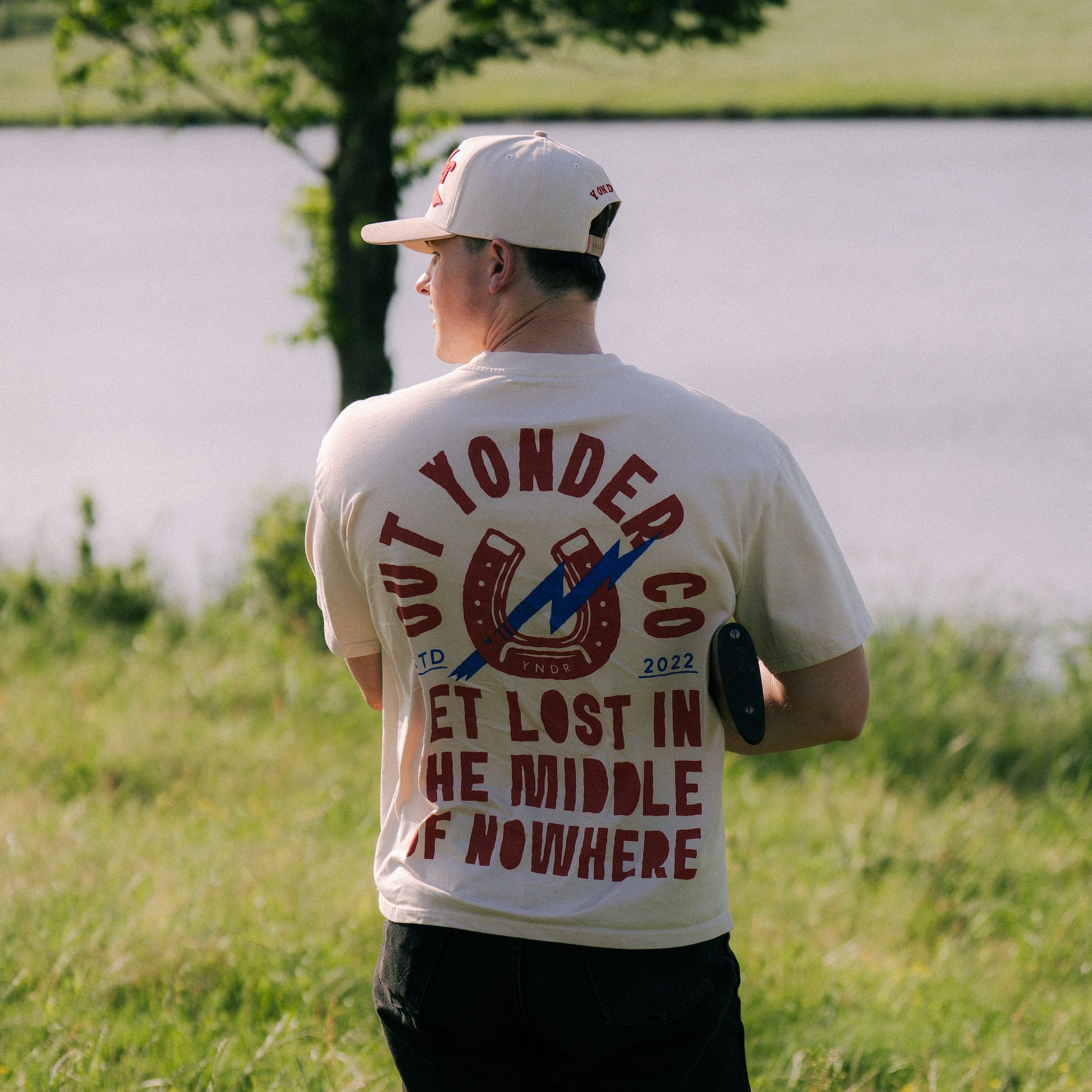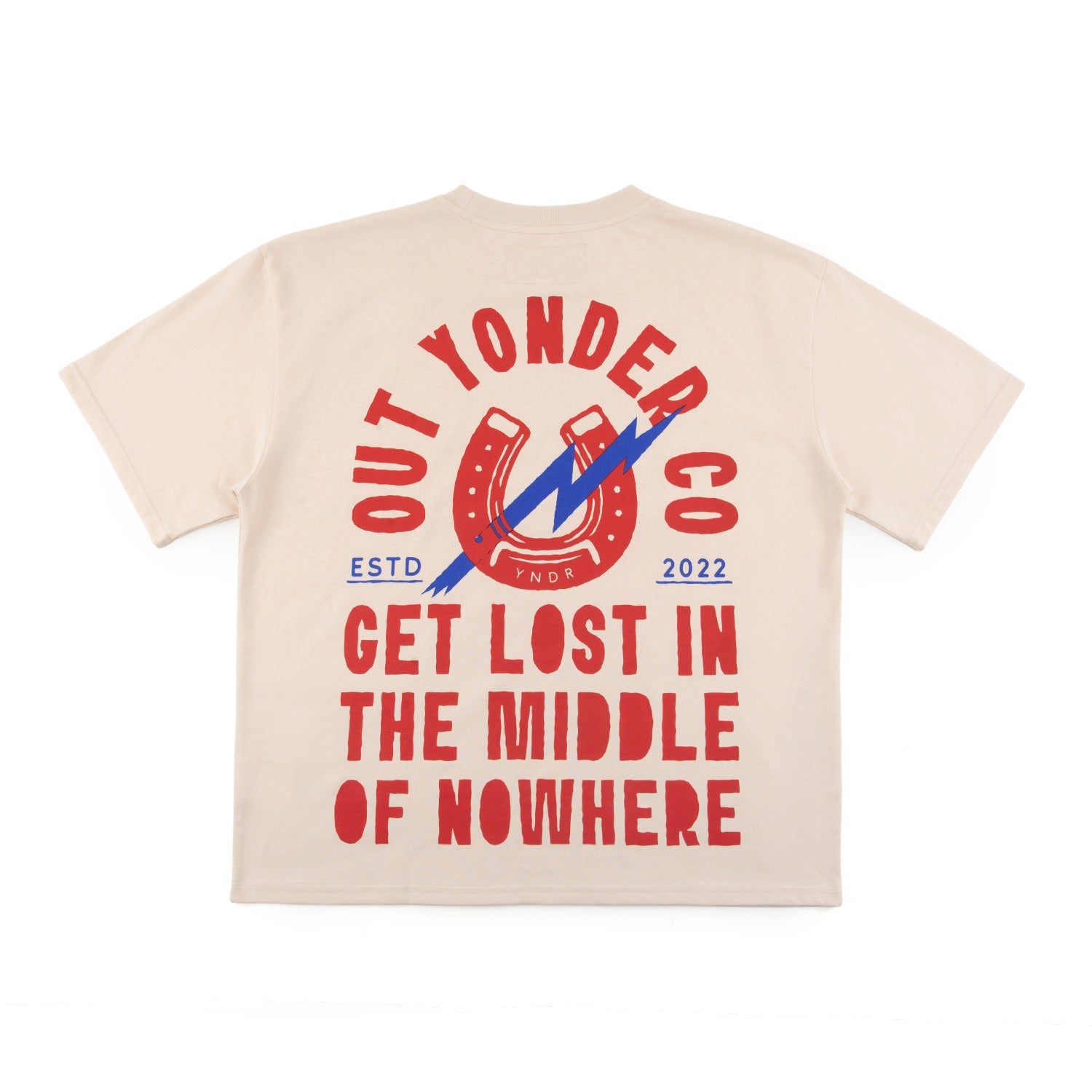 The Lost Boxy Tee features a bold graphic stamped with Get Lost in the Middle of Nowhere, wrapped around a lucky horseshoe split by a lightning bolt.