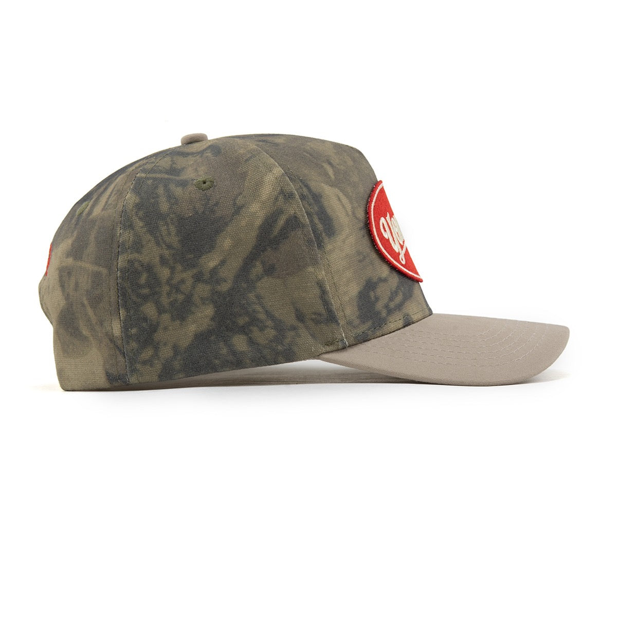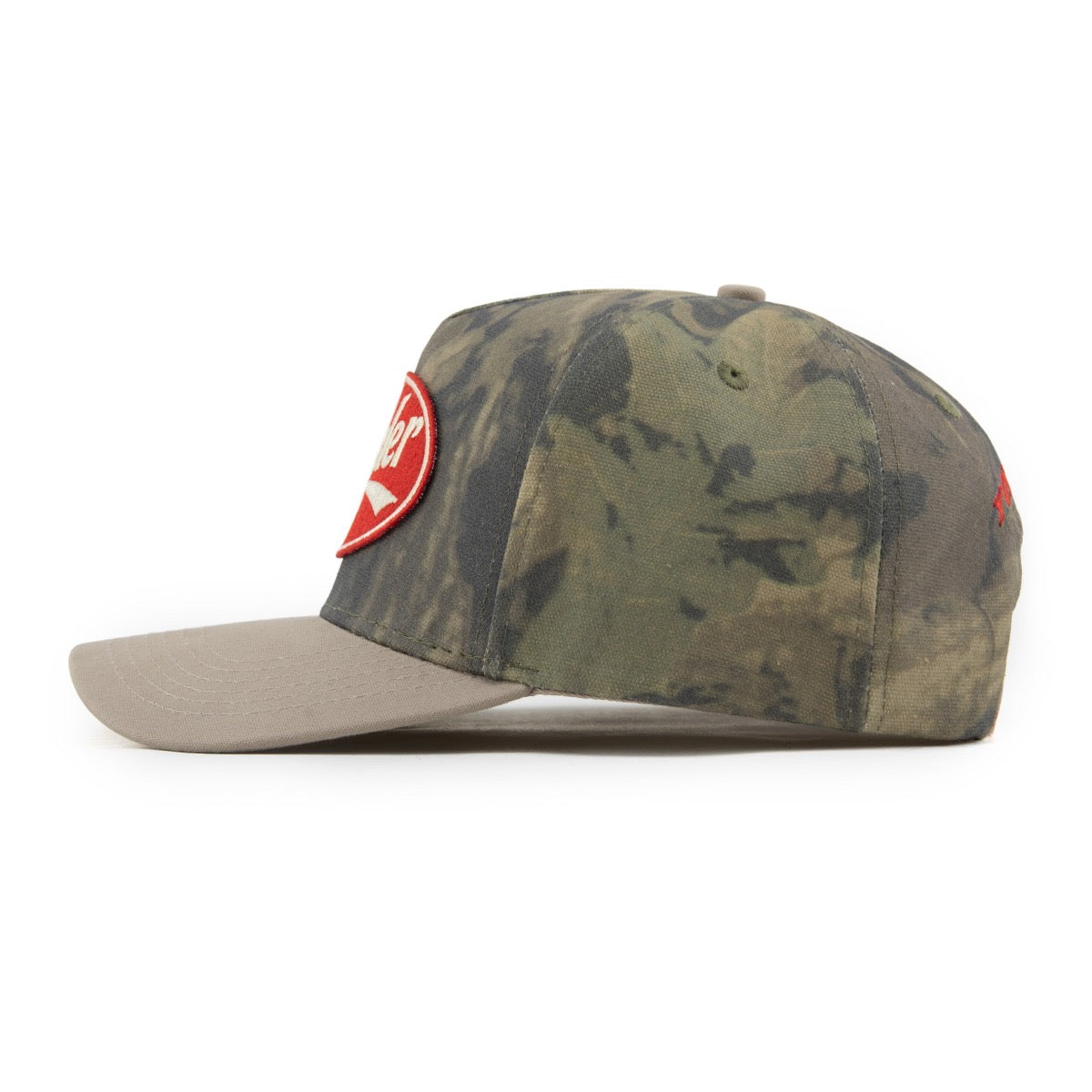 Looks like it came off the shelf of your granddad’s favorite feed store—and that’s the point. The Country Store Snapback pairs a weathered camo crown with a tan bill and a bold red oval patch. It’s classic, clean, and built for folks who still pay in cash and wave at every truck that passes.