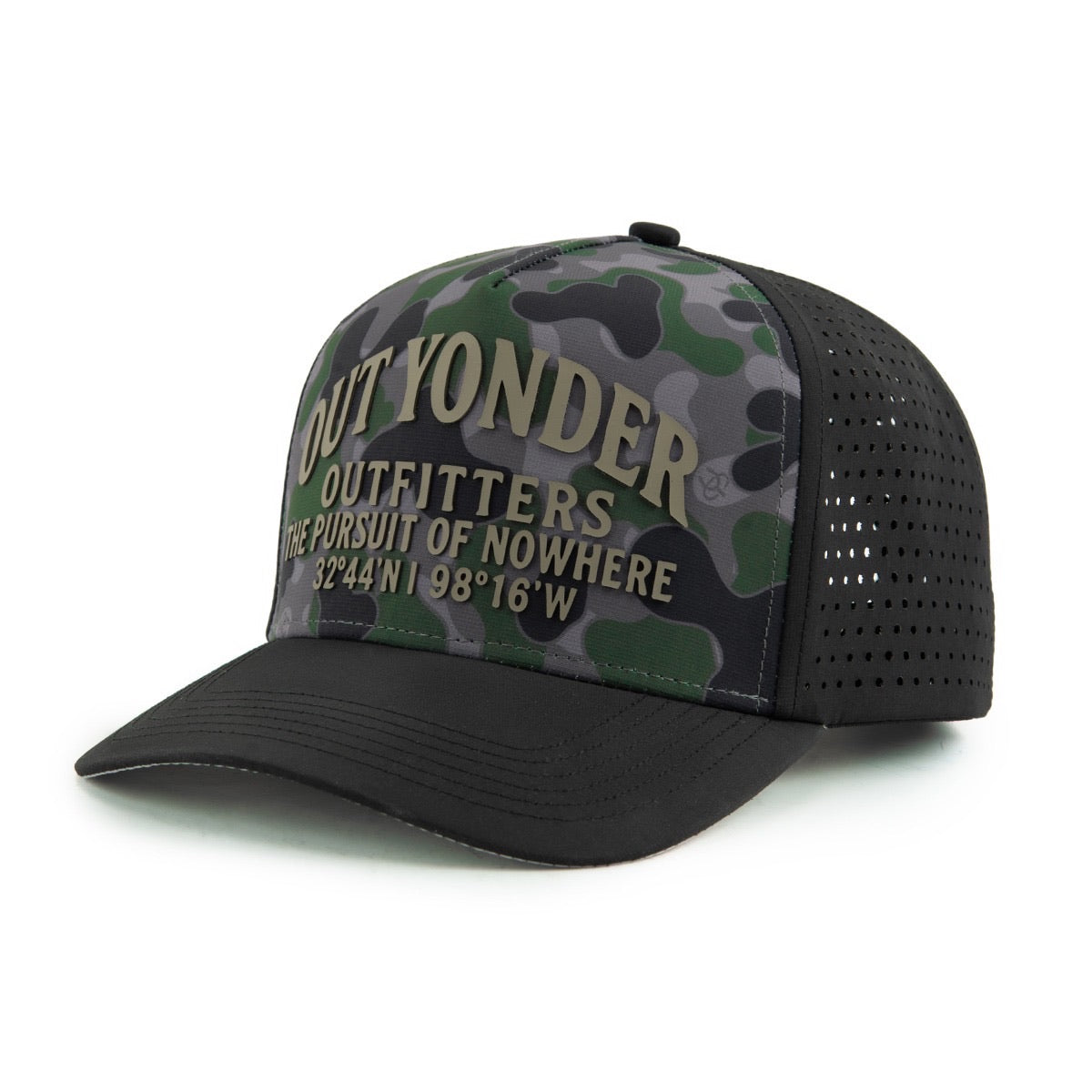 The Outfitter is built for the folks who know where they’re headed, even if it’s deep into the middle of nowhere. With a stealthy camo front, raised rubber Out Yonder lettering, and GPS coordinates printed right on the crown. Perforated performance mesh keeps you cool on the move, while the structured fit and black bill tie it all together with a clean, technicallity. It’s the perfect crossover hat — tough enough for long days in the field, dialed enough for everything after.