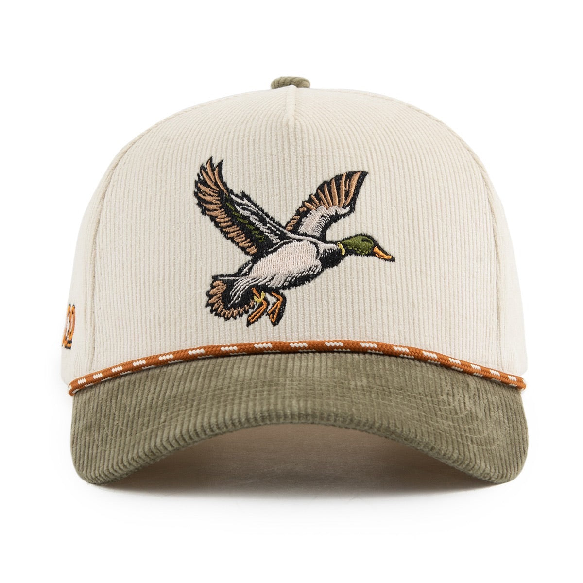 A textured corduroy crown pairs with an earth-toned bill, giving it that worn-in, straight-off-the-marsh character. Front and center, a bold mallard embroidery brings the whole story home.