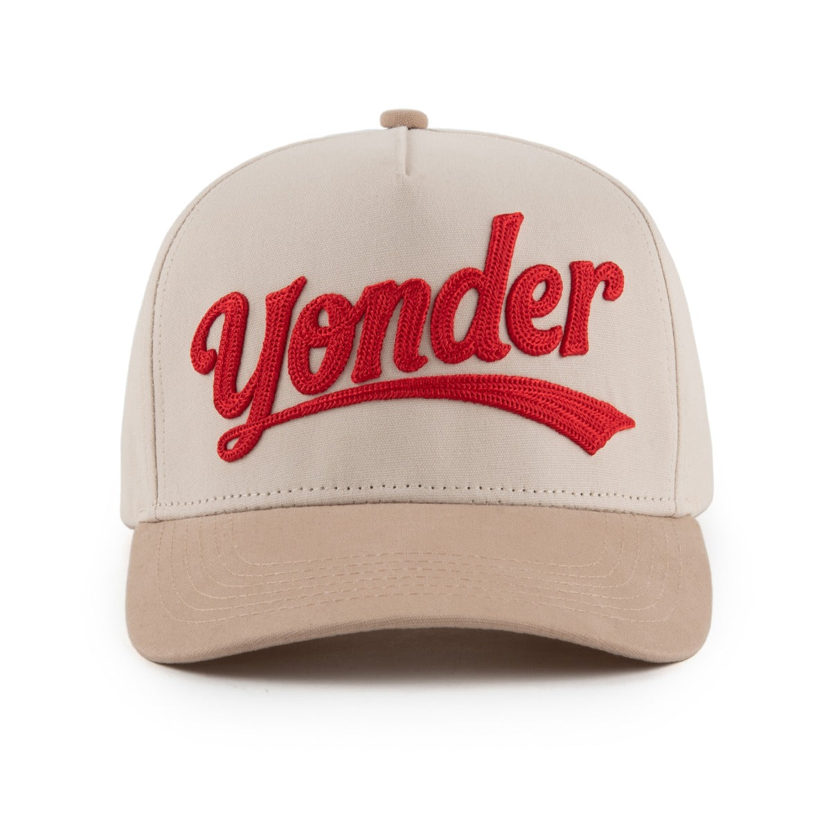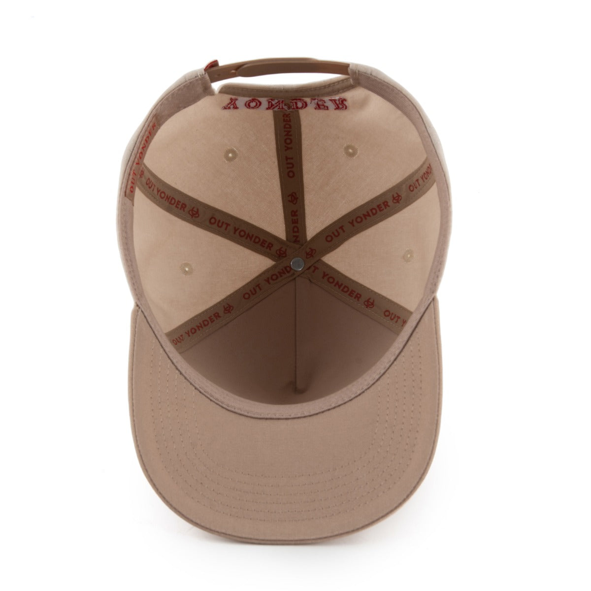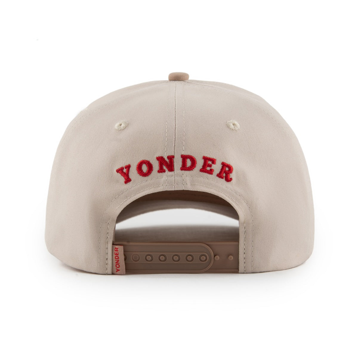 This one’s as bold as it is classic. The Yonder Branded Snapback throws it back with chain-stitched lettering straight off a ‘70s team rodeo jacket—but built tougher, for long days under the sun. With a 5-panel shape and crisp off-white and tan colorway, it’s clean enough for town and rugged enough for camp.
